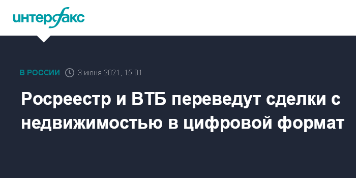 Москва. 3 июня. INTERFAX.RU - Росреестр и банк ВТБ планируют полностью перейти на электронное взаимодействие и перевести все сделки с недвижимостью в цифровой формат.