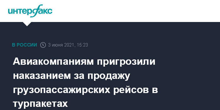 Москва. 3 июня. INTERFAX.RU - Росавиация пригрозила авиакомпаниям ограничительными мерами при выявлении фактов продажи грузопассажирских рейсов в составе турпакетов, об этом говорится в сообщении ведомства в четверг.