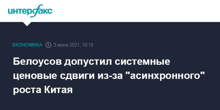 Москва. 3 июня. INTERFAX.RU - Восстановление китайской экономики опережающими остальной мир темпами из-за специфики генерируемого ей спроса чревато не просто разовой волной инфляционного давления, а системными ценовыми сдвигами на глобальном рынке, считает первый вице-премьер Андрей Белоусов.