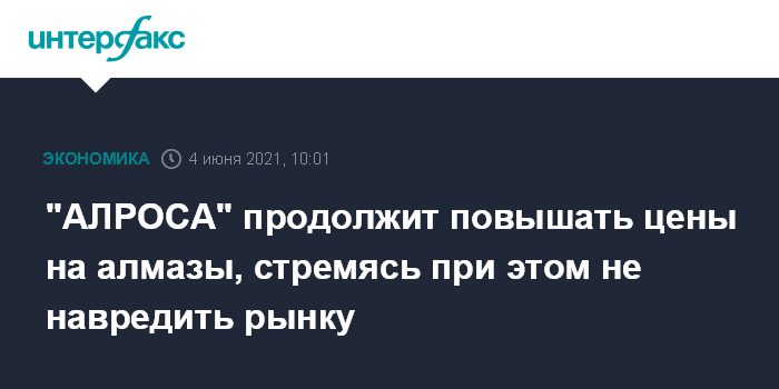 Москва. 4 июня. INTERFAX.RU - "АЛРОСА" продолжит поступательно повышать цены на алмазы, опираясь на сильный спрос со стороны огранщиков, но стремится при этом не повредить балансу рынка, чтобы обеспечить "здоровье" отрасли, сказал "Интерфаксу" в кулуарах Петербургского международного экономического форума (ПМЭФ) глава компании Сергей Иванов.