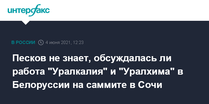 Москва. 4 июня. INTERFAX.RU - Пресс-секретарь президента Дмитрий Песков не знает, обсуждали ли Владимир Путин и белорусский лидер Александр Лукашенко работу "Уралкалия" и "Уралхима" в Белоруссии на недавних переговорах в Сочи.