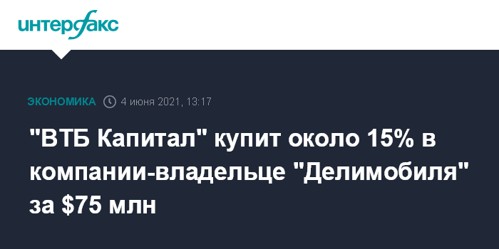 Москва. 4 июня. INTERFAX.RU - "ВТБ Капитал" приобретает за $75 млн миноритарную долю в компании Delimobil Holding S.A., которая развивает каршеринговые проекты "Делимобиль", Anytime и Anytime.Prime. Соответствующее соглашение подписали первый заместитель президента - председателя правления ВТБ Юрий Соловьев и основатель "Делимобиль" Винченцо Трани на ПМЭФ-2021.
