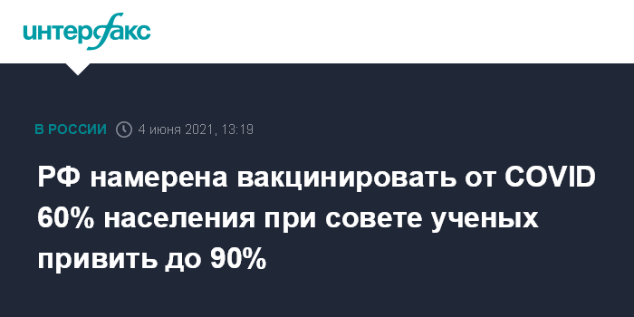 Москва. 4 июня. INTERFAX.RU - В России для создания коллективного иммунитета к коронавирусу необходимо вакцинировать 60% населения; ученые говорят о том, что нужно привить 80%-90% российских граждан, сообщил министр здравоохранения РФ Михаил Мурашко.