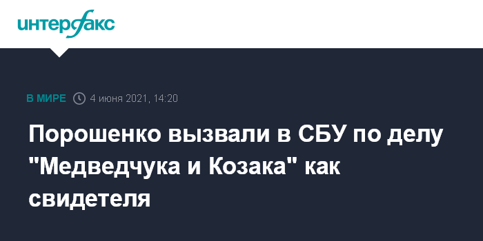 Агентству "Интерфакс-Украина" в пресс-центре СБУ сообщили, что Порошенко вызвали в качестве свидетеля в уголовном производстве по подозрению нардепов Виктора Медведчука и Тараса Козака (их подозревают в "государственной измене и покушении на разграбление национальных ресурсов на временно оккупированной территории Крыма").
