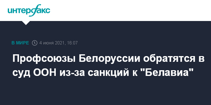 Москва. 4 июня. INTERFAX.RU - Федерация профсоюзов Белоруссии (ФПБ) инициирует иск в Международный суд ООН из-за санкций в отношении "Белавиа", сообщается на сайте ФПБ.