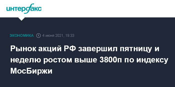 Москва. 4 июня. INTERFAX.RU - Рынок акций РФ завершил пятницу и неделю ростом выше 3800 пунктов по индексу МосБиржи благодаря подорожавшей нефти, слабой статистике по рынку труда США и ряду заявлений президента РФ Владимира Путина на Петербургском международном экономическом форуме (ПМЭФ). Локомотивом подъема в пятницу выступили акции "Газпрома", "НОВАТЭКа", "ЛУКОЙЛа" и расписки TCS Group на корпоративных новостях.