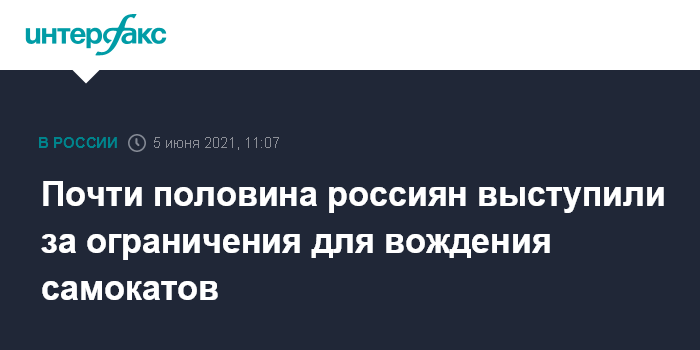 Москва. 5 июня. INTERFAX.RU - Идею введения ограничений на законодательном уровне для вождения самокатов и электросамокатов поддерживают около половины россиян (49%), свидетельствуют данные опроса Исследовательского центра портала SuperJob.ru, поступившие в субботу в "Интерфакс".