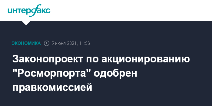 Москва. 5 июня. INTERFAX.RU - Правительственная комиссия по законопроектной деятельности одобрила законопроект по акционированию ФГУП "Росморпорт", сообщил "Интерфаксу" генеральный директор предприятия Александр Смирнов в кулуарах ПМЭФ-2021.