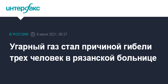 Москва. 9 июня. INTERFAX.RU - Причиной гибели людей во время пожара в коронавирусной реанимации рязанской больницы стал угарный газ, сообщили "Интерфаксу" в администрации клиники в среду утром.