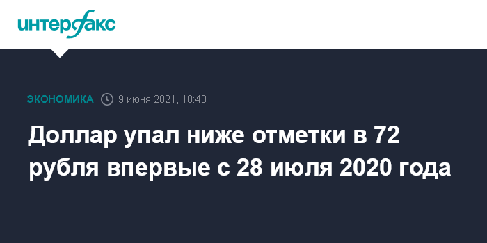 Москва. 9 июня. INTERFAX.RU - Доллар и евро дешевеют на Московской бирже в среду утром. При этом доллар опустился ниже отметки 72 руб./$1 впервые с 28 июля 2020 года, евро торгуется ниже 88 руб./EUR1.