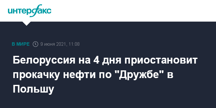 Москва. 9 июня. INTERFAX.RU - Белорусская сторона на несколько дней приостанавливает прокачку нефти в направлении Польши для плановых работ на нефтепроводе "Дружба".