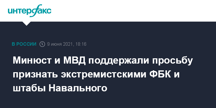Москва. 9 июня. INTERFAX.RU - Представители МВД РФ и Министерства юстиции РФ в Мосгорсуде считают, что иск московской прокуратуры о признании экстремистскими и запрете Фонда борьбы с коррупцией, Фонда защиты прав граждан (ФБК и ФЗПГ, включены в реестр НКО, исполняющих в РФ функции иностранных агентов), а также так называемых штабов Навального, должен быть удовлетворен в полном объеме.