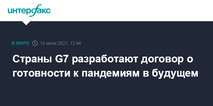 Москва. 10 июня. INTERFAX.RU - Страны "группы семи" (G7) начнут разработку договора о готовности к пандемиям в будущем и пообещают распространить вакцины от коронавируса COVID-19 по всему миру до конца следующего года, сообщил премьер-министр Великобритании Борис Джонсон.
