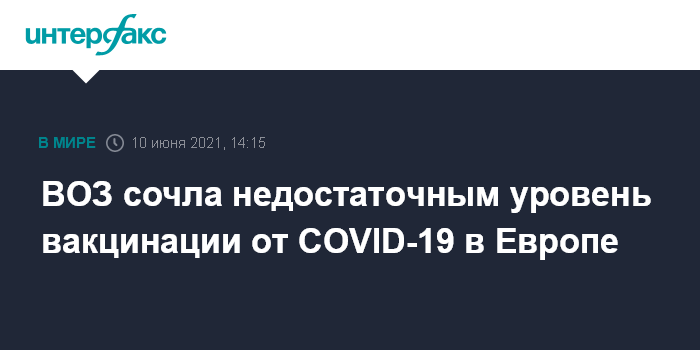 Москва. 10 июня. INTERFAX.RU - Уровень вакцинации от коронавируса в Европе недостаточен, чтобы предотвратить повторные вспышки коронавирусной инфекции, считает Всемирная организация здравоохранения. Об этом на пресс-конференции заявил директор Европейского бюро ВОЗ Ханс Клюге.