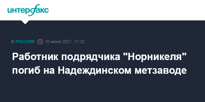 Москва. 10 июня. INTERFAX.RU - Работник подрядной организации "Норникеля" погиб при проведении ремонтных работ на Надеждинском металлургическом заводе "Норникеля", сообщила компания.