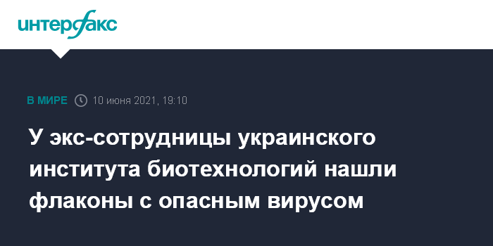 Москва. 10 июня. INTERFAX.RU - Бывшая сотрудница украинского Государственного научно-контрольного института биотехнологий и штаммов присвоила флаконы со штаммами вируса опасной болезни, сообщил Офис генпрокурора Украины со ссылкой на данные следствия.