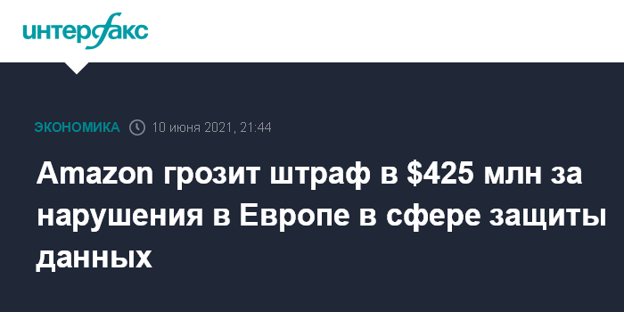 Москва. 10 июня. INTERFAX.RU - Американскому интернет-ритейлеру Amazon.com Inc. грозит штраф в размере $425 млн за нарушение европейских практик в сфере защиты данных, пишет газета The Wall Street Journal со ссылкой на информированные источники.
