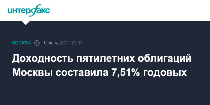 Москва. 10 июня. INTERFAX.RU - Доходность пятилетних облигаций Москвы 73-й серии составила 7,51% годовых, размещены бумаги объемом 9 236 884 000 рублей из планируемого объема в 35 млрд рублей, сообщает сайт mos.ru.