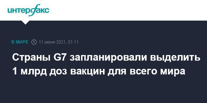 Москва. 10 июня. INTERFAX.RU - Страны "Большой семерки" намерены выделить как минимум 1 млрд доз вакцин от коронавируса для других государств, заявил премьер-министр Великобритании Борис Джонсон. Об этом сообщает Associated Press.
