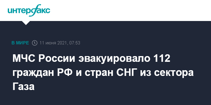 Москва. 11 июня. INTERFAX.RU - МЧС эвакуировало 112 граждан России и стран СНГ из сектора Газа в Москву из-за кризиса в регионе, сообщило в пятницу посольство России в Египте на своей странице в Facebook.