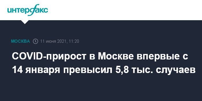 Москва. 11 июня. INTERFAX.RU - Более 5,8 тысячи случаев заболевания коронавирусом зафиксировали в Москве за сутки, это максимальное значение с 14 января, следует из данных оперативного штаба по контролю ситуации с COVID-19.