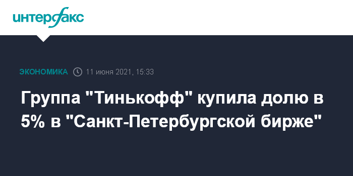 Москва. 11 июня. INTERFAX.RU - Группа "Тинькофф" (TCS Group) приобрела долю в размере 5% в "Санкт-Петербургской бирже" у ее основного акционера – ассоциации "НП РТС", говорится в сообщении банка.
