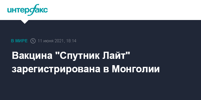Москва. 11 июня. INTERFAX.RU - Монголия зарегистрировала российскую однокомпонентную вакцину от коронавируса "Спутник Лайт". Об этом сообщает в пятницу Российский фонд прямых инвестиций.