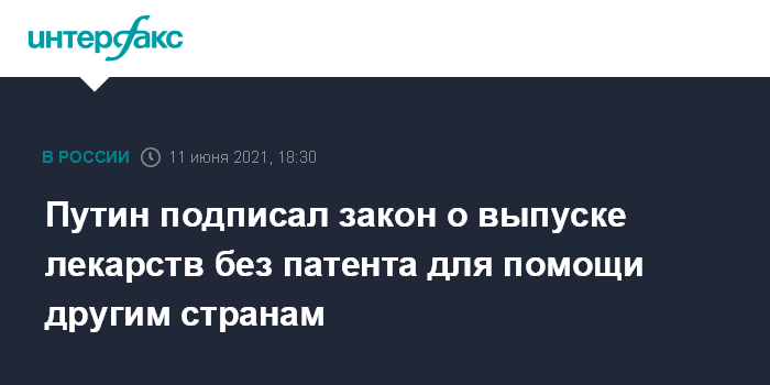 Москва. 11 июня. INTERFAX.RU - Президент России Владимир Путин подписал закон, по которому правительство России наделяется правом производить патентованные лекарства для экспорта за рубеж без согласия патентообладателя.