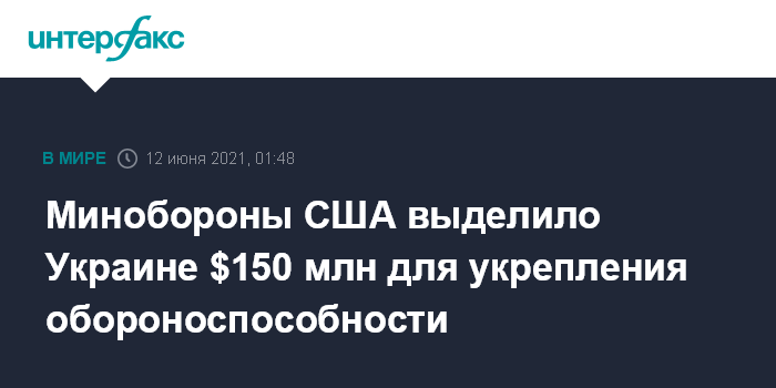 Москва. 12 июня. INTERFAX.RU - Министерство обороны США утвердило $150 млн помощи Украине для укрепления обороноспособности, в том числе на обучение и консультации, сообщает посольство США в Украине.