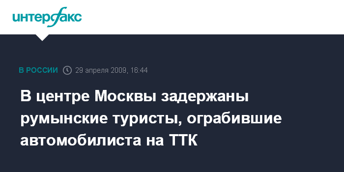 "Сотрудникам отдела милиции Пресненского района удалось задержать троих грабителей. Ими оказались туристы из Румынии: 30, 26 и 25 лет. Потерпевший уже опознал своих обидчиков. При обыске салона "Опеля" милиционеры нашли не только украденные у москвича вещи, но также российские рубли, небольшие золотые слитки и гранату, которая была отправлена на экспертизу", - рассказал собеседник "Интерфакса".