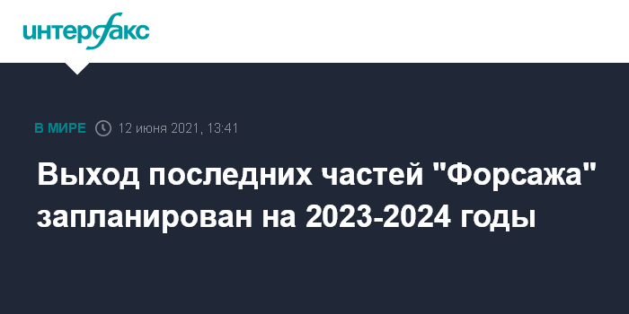 Москва. 12 июня. INTERFAX.RU - Вин Дизель сообщил об ожидаемых датах выхода заключительных частей в серии "Форсаж": релиз двух фильмов запланирован на 2023 и 2024 годы.