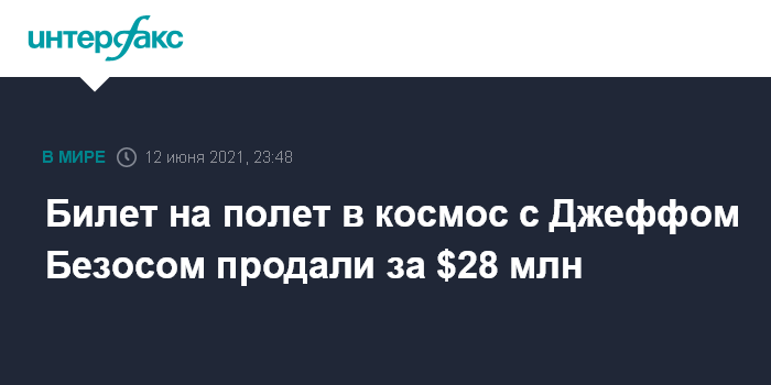 Москва. 12 июня. INTERFAX.RU - Место на полет в космос с основателем Amazon Джеффом Безосом было продано на аукционе за $28 млн, следует из трансляции торгов на сайте космической компании Blue Origin.
