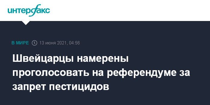 Москва. 13 июня. INTERFAX.RU - Граждане Швейцарии должны намерены проголосовать на референдуме в это воскресенье за запрет использования пестицидов. Это может привести к тому, что их страна станет второй в мире после Бутана, отказавшейся от химических средств для борьбы с вредителями растений. Об этом сообщает BBC News.