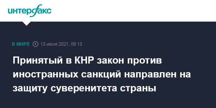 Москва. 13 июня. INTERFAX.RU - Закон "О противодействии иностранным санкциям", принятый 10 июня 2021 года Постоянным комитетом Всекитайского собрания народных представителей (ПК ВСНП) на этой неделе, является юридическим инструментом защиты суверенитета КНР, прав и интересов его граждан, говорится в комментариях китайских экспертов, которые приводят местные СМИ.