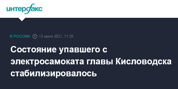 Москва. 13 июня. INTERFAX.RU - Состояние главы города-курорта Кисловодска (Ставропольский край) Александра Курбатова, который накануне был прооперирован после падения с электросамоката, остается тяжелым, сообщили "Интерфаксу" в воскресенье в мэрии города.