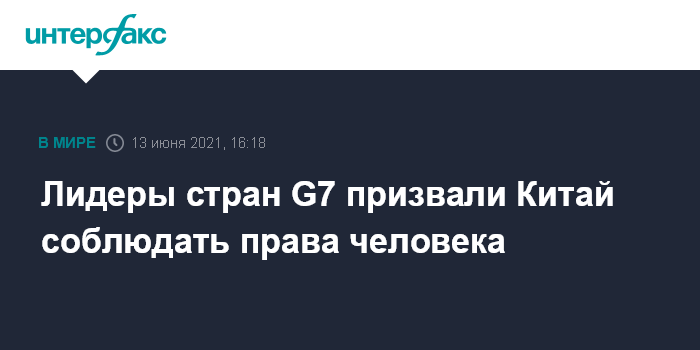 Москва. 13 июня. INTERFAX.RU - Участники саммита G7 в воскресенье призвали Китай не нарушать права человека, сообщает Bloomberg со ссылкой на коммюнике, одобренное по итогам встречи в верхах.