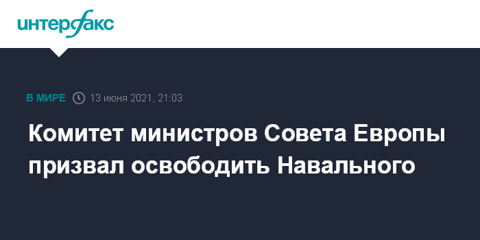 Москва. 13 июня. INTERFAX.RU - Комитет министров Совета Европы призвал российские власти освободить оппозиционера Алексея Навального и отменить ему приговор по делу "Ив Роше", сообщает в воскресенье пресс-служба Совета Европы.
