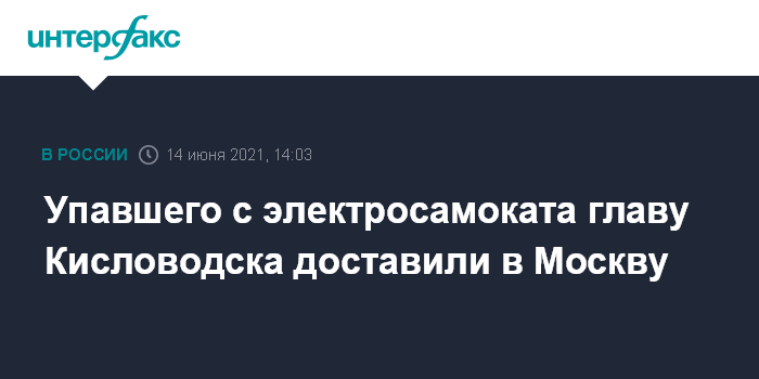 Москва. 14 июня. INTERFAX.RU - Глава Кисловодска (Ставропольский край) Александр Курбатов, которого в минувшую субботу прооперировали после падения с электросамоката, доставлен в Москву, сообщили "Интерфаксу" в понедельник в пресс-службе мэрии города.