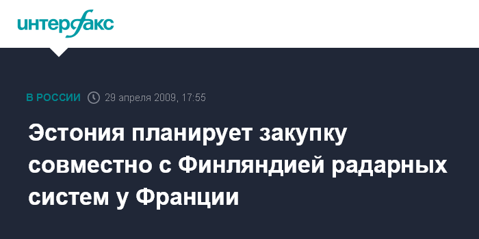Москва. 29 апреля. INTERFAX.RU - Эстония планирует закупить совместно с Финляндией 14 радарных систем среднего радиуса действия.