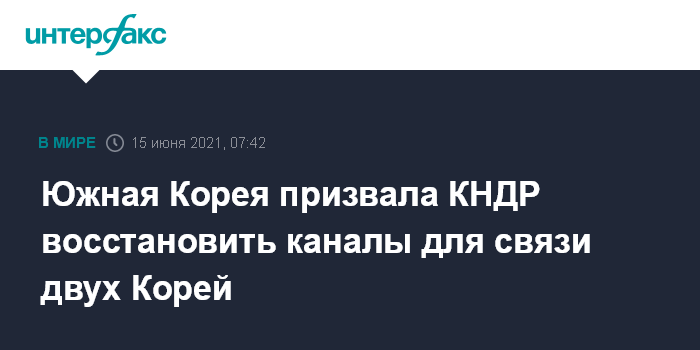 Москва. 15 июня. INTERFAX.RU - Министерство по делам объединения двух Корей во вторник призвало КНДР немедленно восстановить межкорейские линии связи.