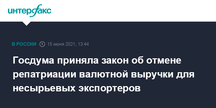 Москва. 15 июня. INTERFAX.RU - Госдума приняла в окончательном, третьем, чтении закон, который с 1 июля текущего года отменяет для несырьевого неэнергетического экспорта требование об обязательной репатриации на счета участников ВЭД в уполномоченных банках иностранной валюты. Речь идет о контрактах и выручке за переданные товары, оказанные работы или услуги, переданную информацию или результаты интеллектуальной деятельности.
