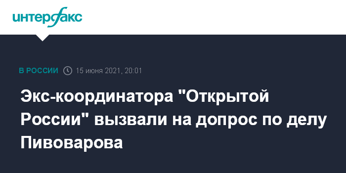 Москва. 15 июня. INTERFAX.RU - Бывший координатор движения "Открытая Россия" (Генпрокуратура признала одноименную британскую организацию нежелательной на территории РФ; прекратило свою деятельность) Татьяна Усманова сообщила, что ее вызвали на допрос по делу экс-директора движения Андрея Пивоварова.