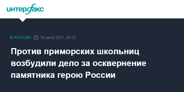 Москва. 16 июня. INTERFAX.RU - Следователи в Приморье возбудили уголовное дело в отношении двух девочек-подростков, задержанных после осквернения памятника погибшему в Сирии Герою России Олегу Пешкову, сообщило следственное управление СКР по региону.