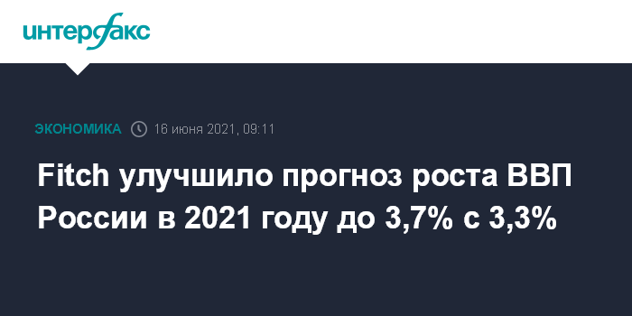 Москва. 16 июня. INTERFAX.RU - Международное рейтинговое агентство Fitch Ratings улучшило прогноз роста российской экономики в текущем году до 3,7% с ожидавшихся в марте 3,3%, говорится в очередном докладе Global Economic Outlook (GEO).
