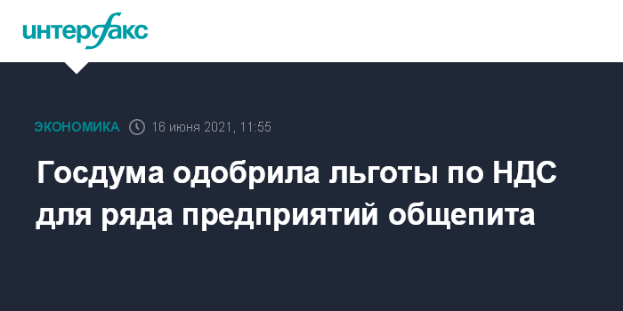 Москва. 16 июня. INTERFAX.RU - Госдума приняла в окончательном, третьем, чтении поправки в Налоговый кодекс (НК) во исполнение поручения президента РФ, которое он дал на ПМЭФ - об освобождении с 1 января 2022 года предприятий общественного питания от уплаты НДС при соблюдении ряда условий.