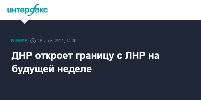 Москва. 16 июня. INTERFAX.RU - Граница между самопровозглашенными Донецкой и Луганской народными республиками будет открыта на следующей неделе, сообщил глава ДНР Денис Пушилин.