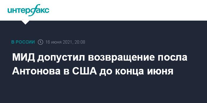 Москва. 16 июня. INTERFAX.RU - Посол РФ в США Анатолий Антонов вернется в Вашингтон до конца этого месяца, заявил замглавы МИД РФ Сергей Рябков.