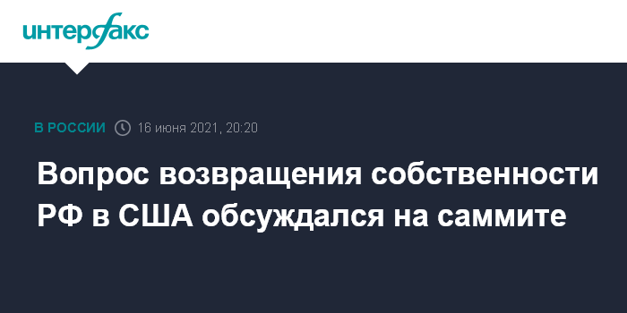 Москва. 16 июня. INTERFAX.RU - Вопрос возвращения российской собственности в США обсуждался в ходе переговоров президентов РФ и Соединенных штатов Владимира Путина и Джо Байдена.