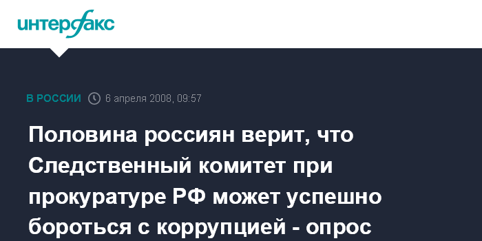 Москва. 6 апреля. ИНТЕРФАКС - Каждый второй опрошенный россиянин считает, что Следственный комитет при прокуратуре (СКП) РФ способен эффективно бороться с коррупцией в органах власти, сообщили социологи.