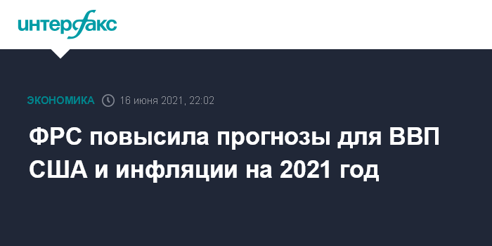Москва. 16 июня. INTERFAX.RU - Федеральная резервная система (ФРС) повысила прогноз роста ВВП США и потребительских цен в 2021 году.